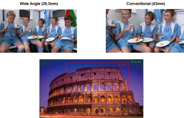 Plačiakampis objektyvas: Kai kuriose vaizdo kamerose yra sumontuotas plačiakampis objektyvas, puikiai tinkantis didžiulėms kalnų ar kraštovaizdžio panoramoms užfiksuoti. Plačiakampis objektyvas labai tinka ir žmonių grupėms filmuoti ar fotografuoti mažose erdvėse.